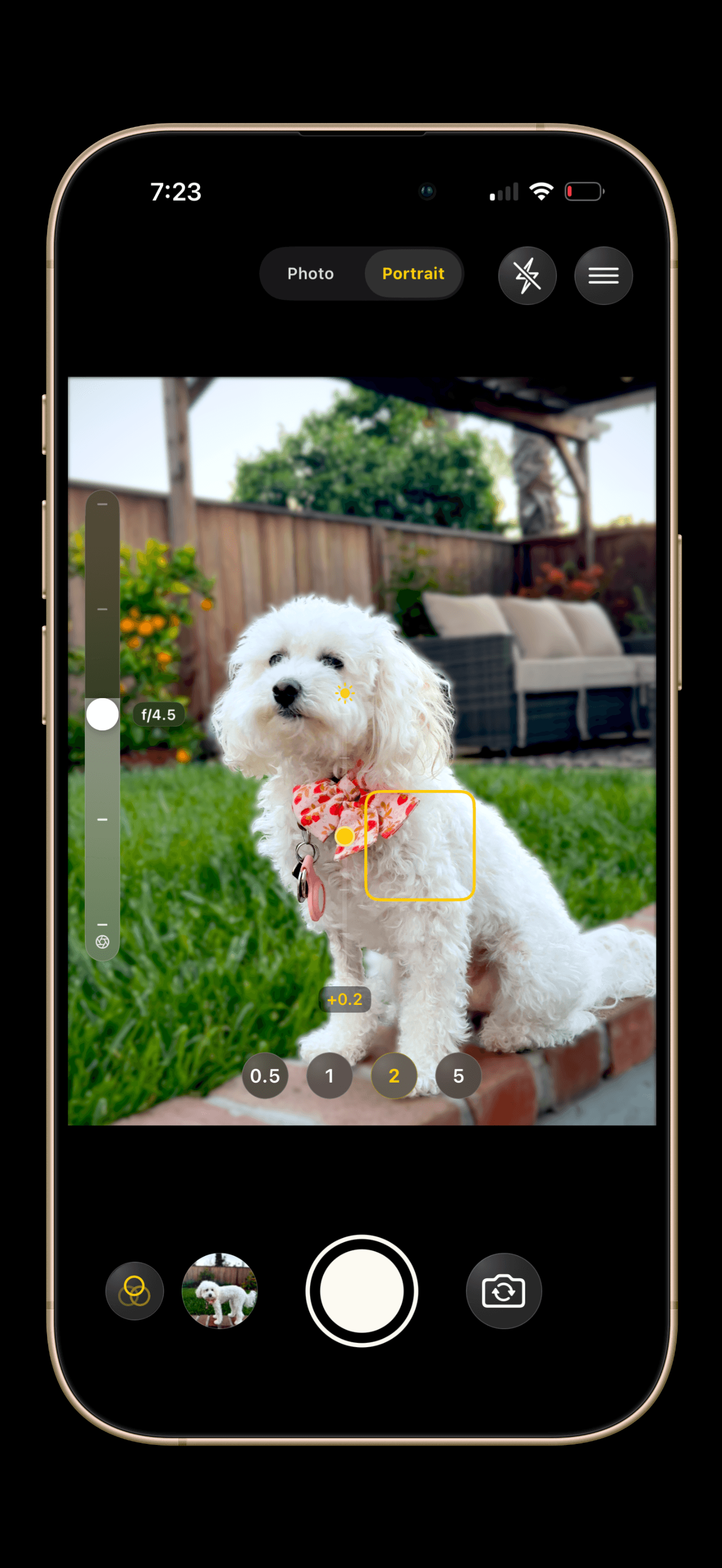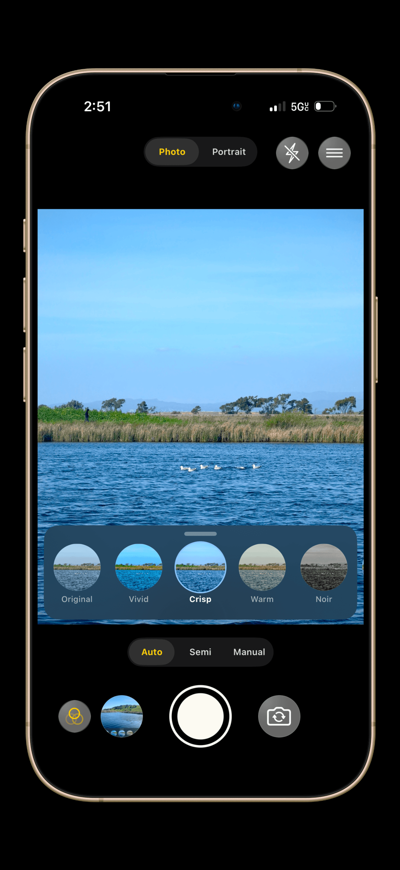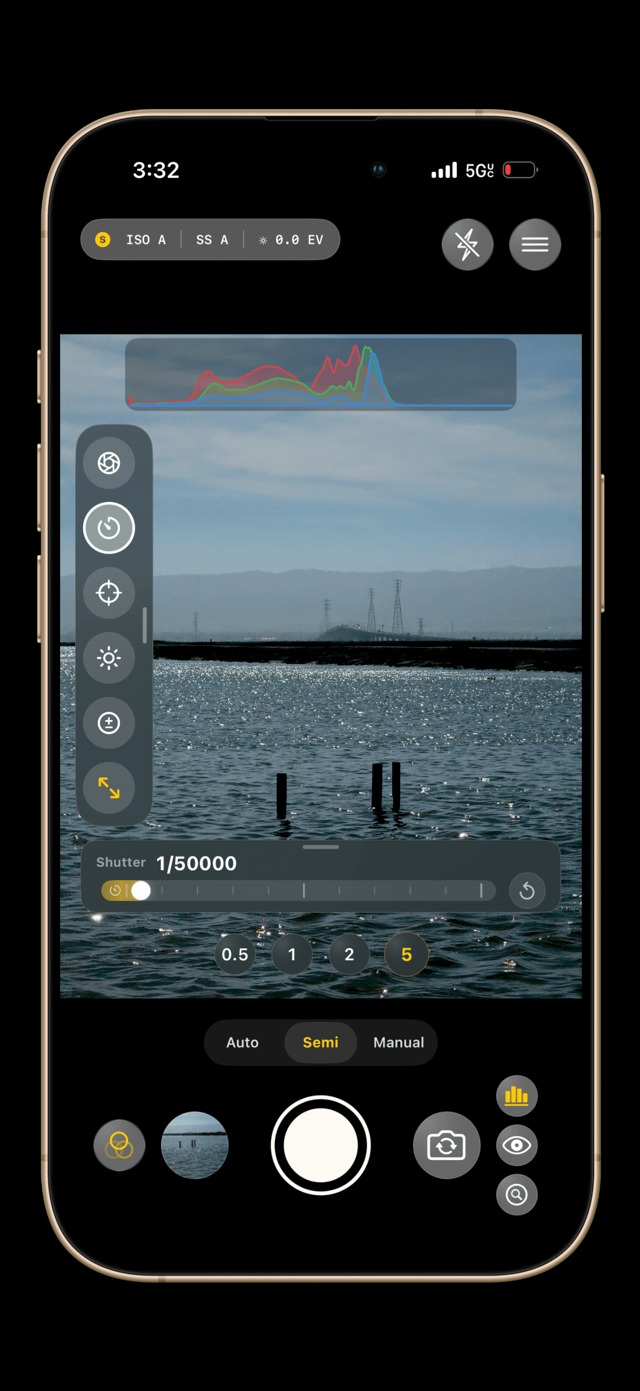 Zoom Pills: Quick-jump buttons (0.5x, 1x, 2x, 5x) sit above the shutter.
