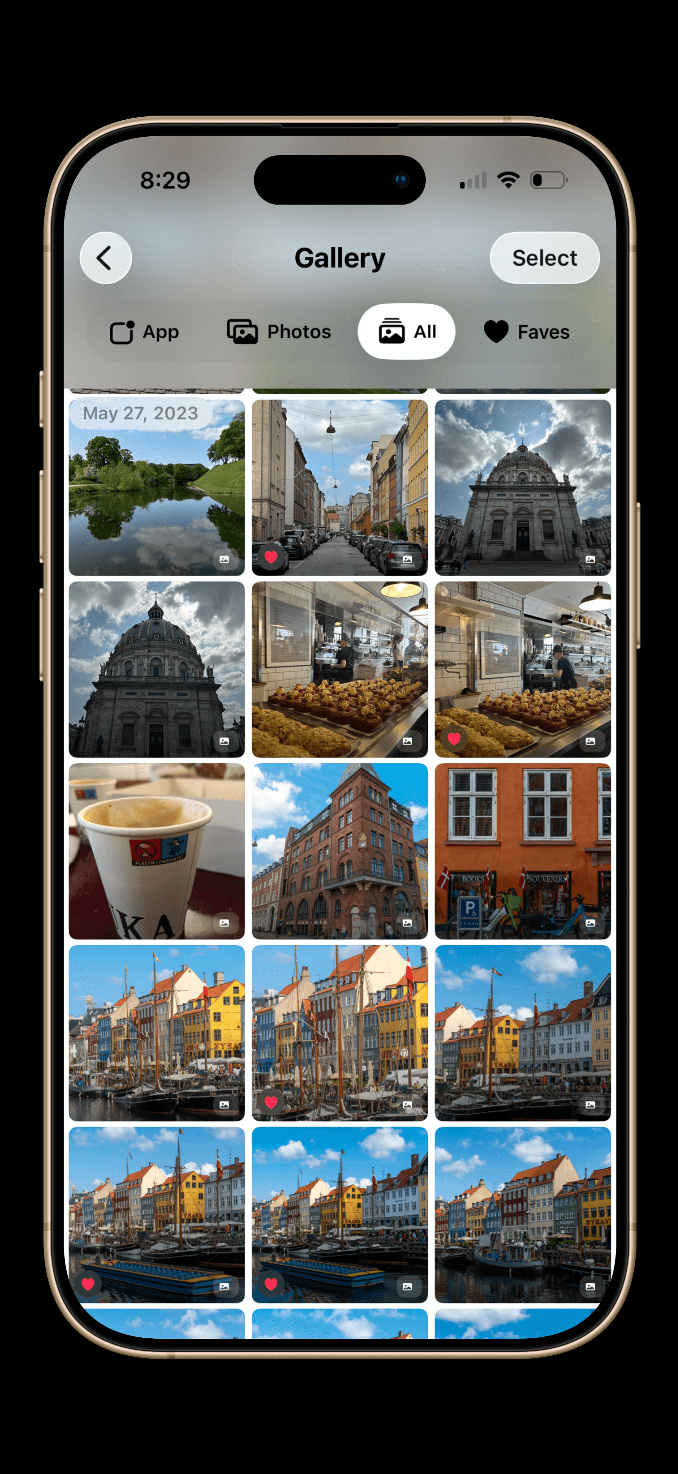 Faves: Photos you have favorited (tap the heart icon to see a custom "liquid heart" animation).
