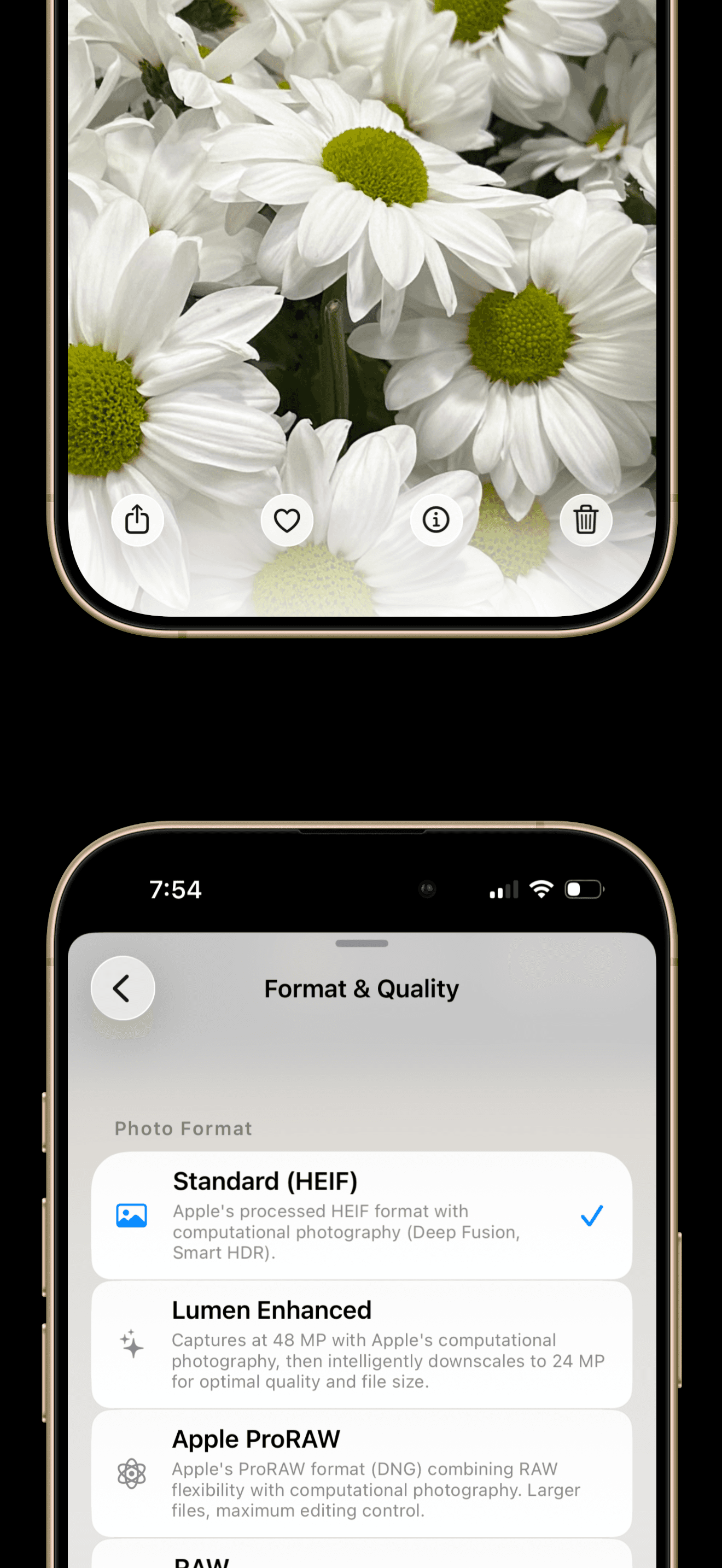 Apple ProRAW (DNG): Apple's computational RAW, retaining Smart HDR data but allowing extreme editing flexibility. Available in 12MP or 48MP.