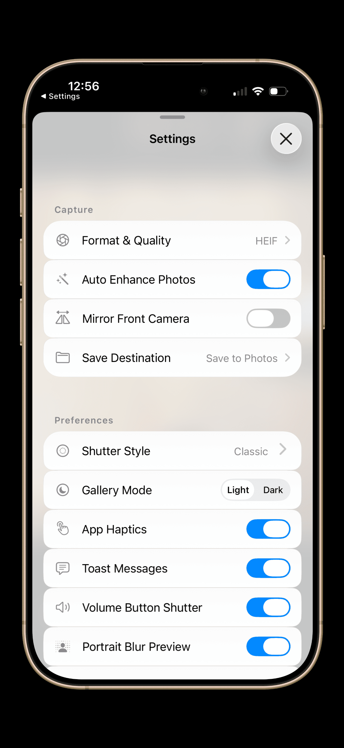 Shutter Style: A cosmetic setting to change the appearance of your capture button (Choose from Metallic, Satin, Glass, Polka, or Apple Classic).